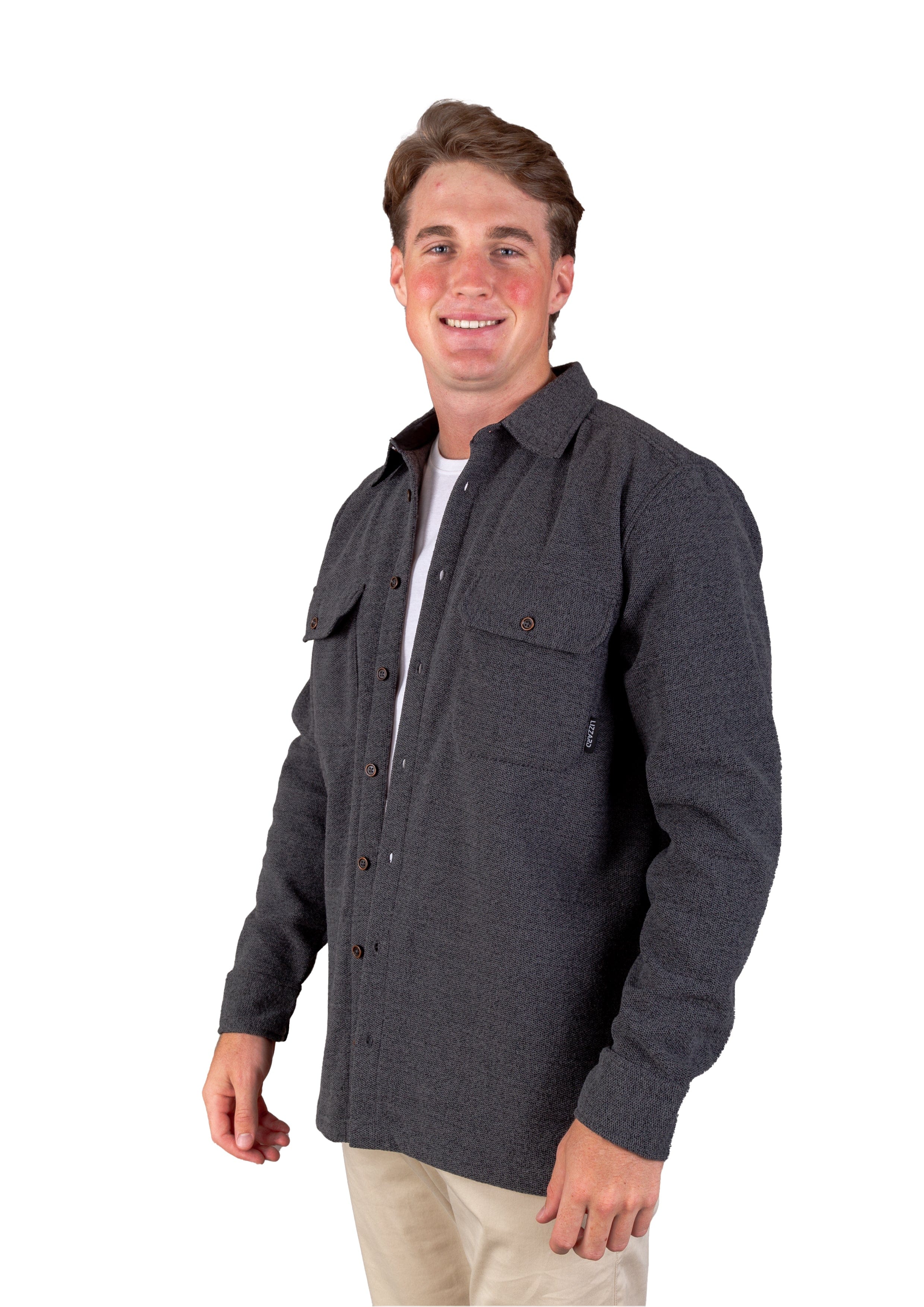 Add some flavour to your winter wardrobe with this charcoal button-up shirt. It boasts a collared neck, long sleeves with cuffed ends, and convenient front pockets. Ideal for chilly days! Track fleece shacket, a warm and thicker-than-usual fleece layer that will keep you cozy with its brushed inner finish.