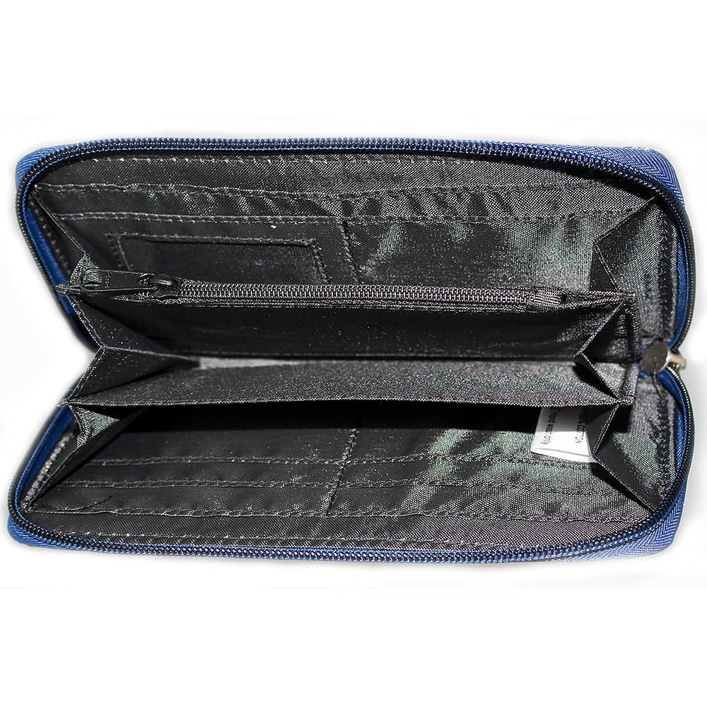 Printed clutch purse with zip. Merrow edge badge. Zip coin pouch, note pocket and card slots.